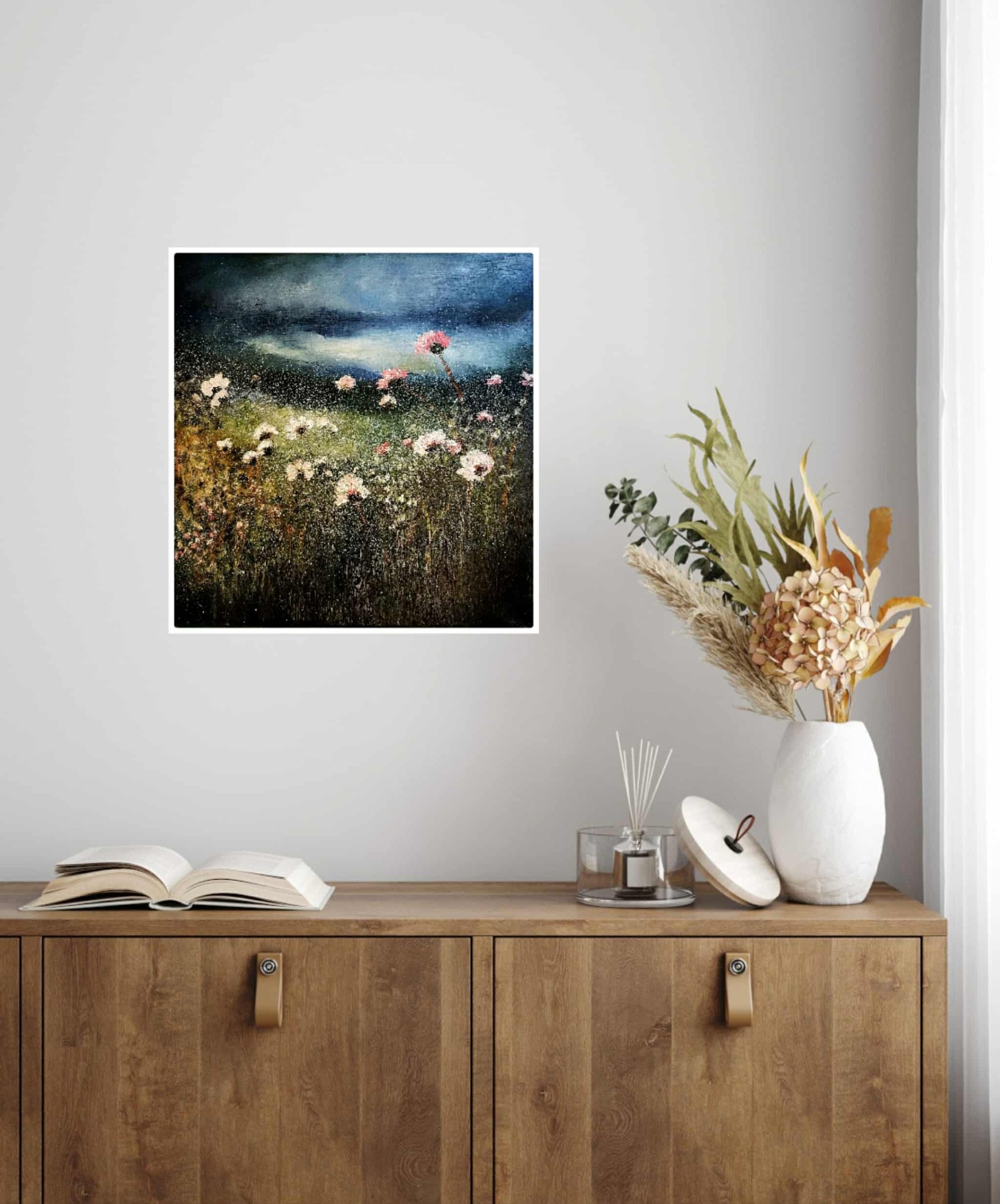 Oljemålning 41×41 cm med vit hemsnickrad träram. Pernilla Moberg 2025