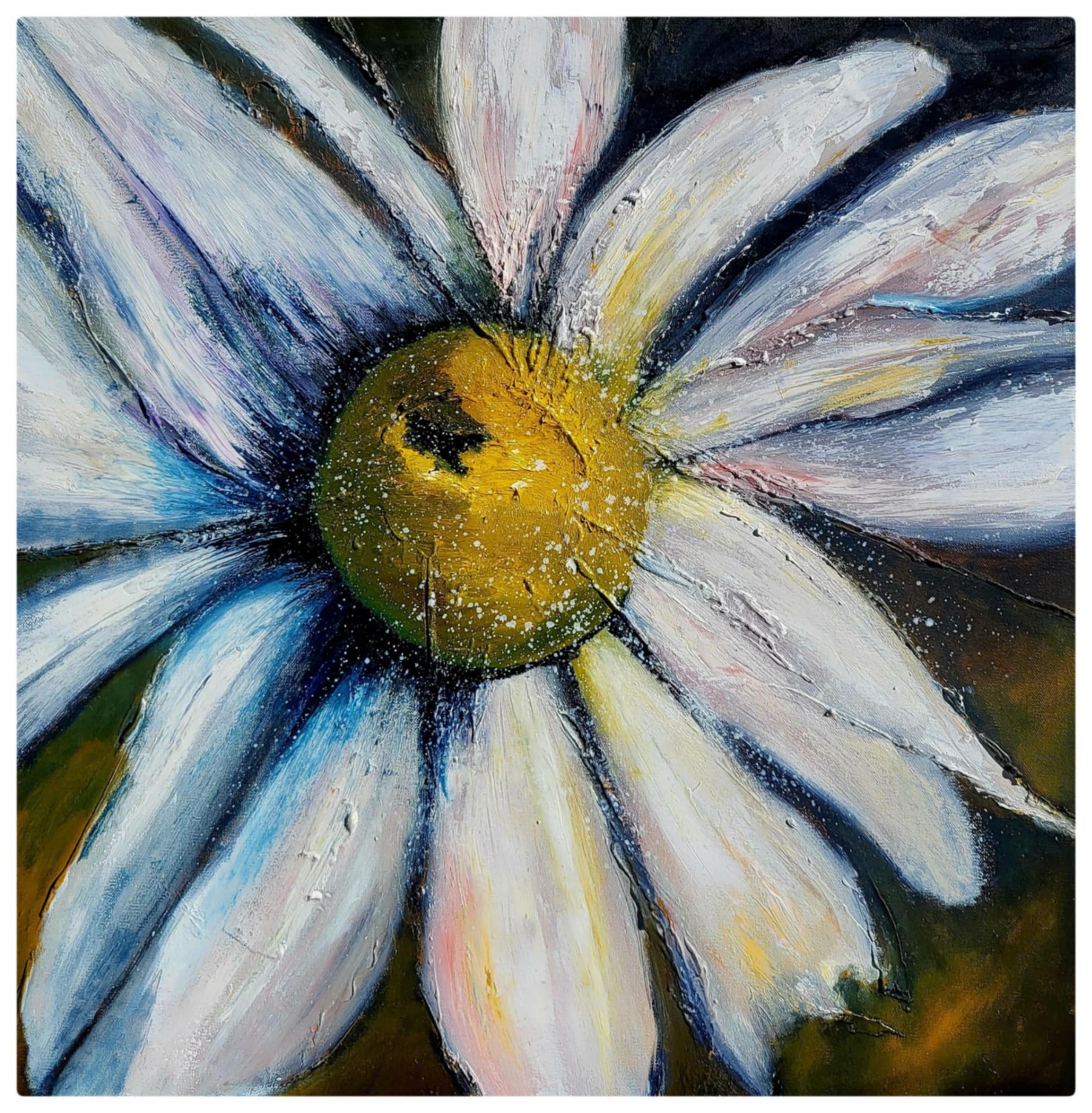 Oljemålning 70×70 cm. Vit hemsnickrad ram, signerad framsida, Pernilla Moberg.