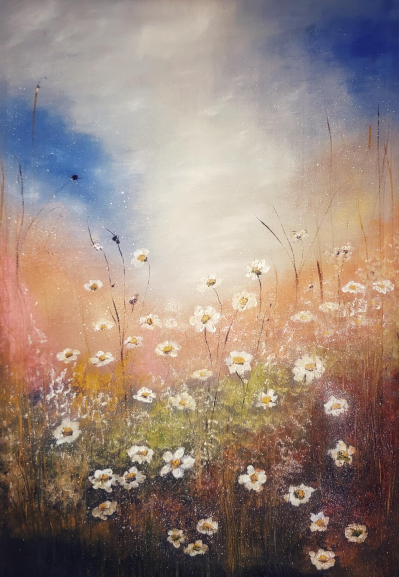 Oljemålning 50×70 cm. Vit hemsnickrad ram. Signerad framsida, Pernilla Moberg.