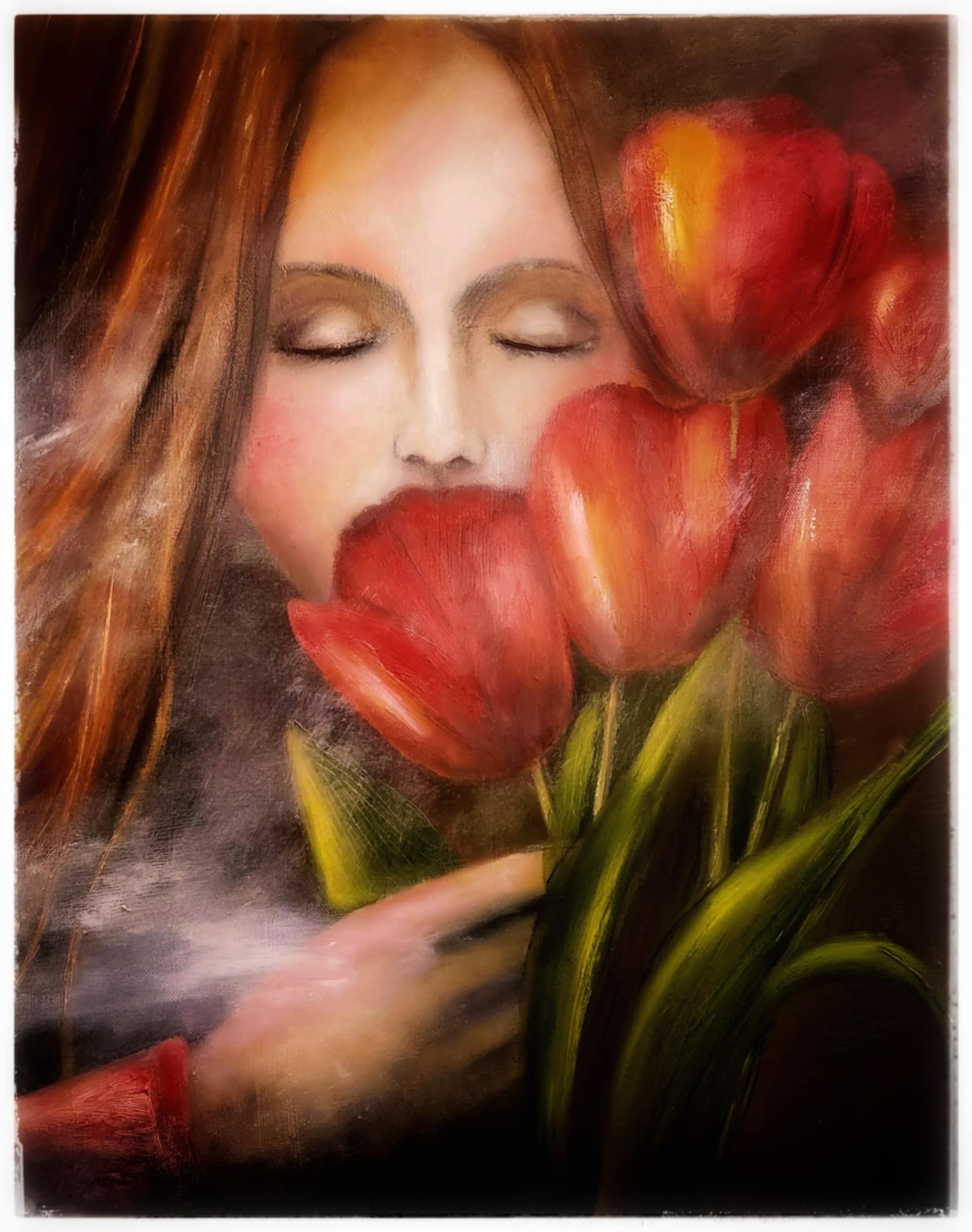 Oljemålning 40×50 cm, signerad framsida. Vit hemsnickrad ram Pernilla Moberg
